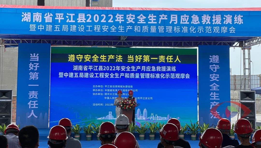 6月23日,由县住房和城乡建设局主办、中国建筑第五工程局有限公司承办的“安全生产月”应急救援演练在颐华城智雅蓝庭项目工地展开。副县长夏海宣布演练开始。