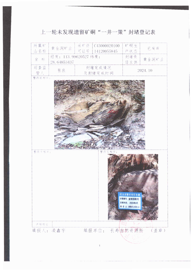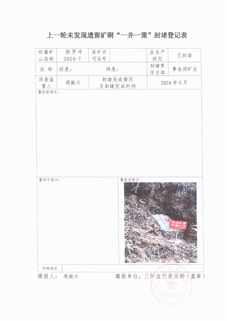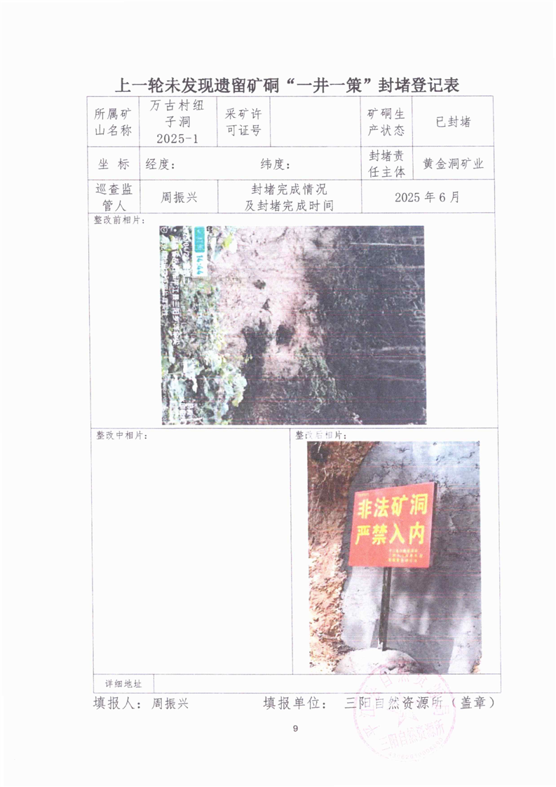 上一轮未发现遗留矿硐“一井一策”封堵登记表