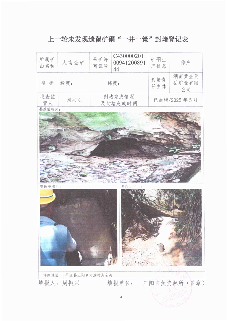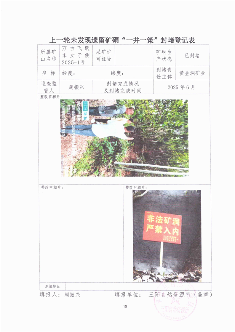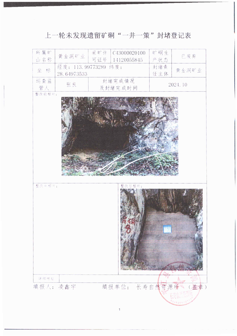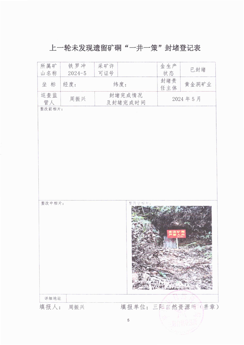 上一轮未发现遗留矿硐“一井一策”封堵登记表