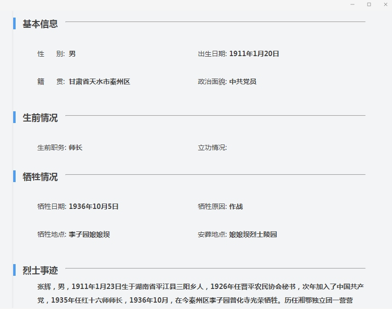 一次偶然机会,张玲琳在中华英烈网的烈士英名录里看到了甘肃省天水市秦州区退役军人事务局发布的张辉烈士信息,“这和爷爷张岳的信息和经历都十分相似,我们终于有机会‘见到’爷爷了。”得到线索的张玲琳立即将信息反馈到了平江县退役军人事务局。