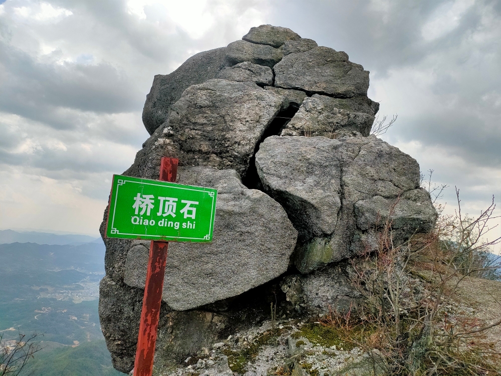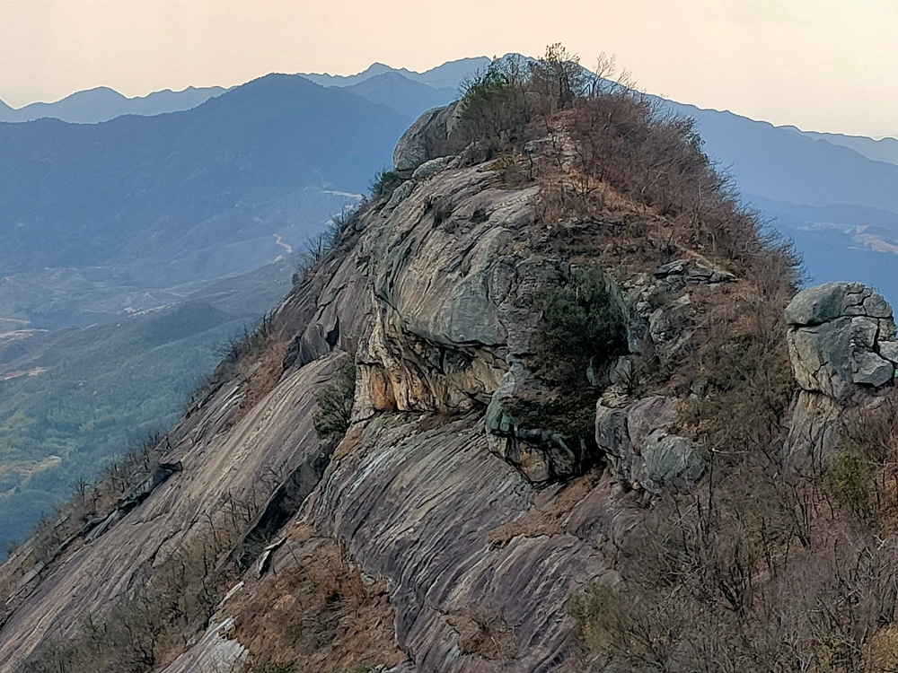 无限风光在险峰。在中峰通往第四峰之处,行人必须从一石洞穿过,才能到达第四峰,除此之外,别无他路,此处名“仙人出洞”景点。人站在破作两半的巨石上方,正愁“山重水复疑无路”时,忽见一根绑定在两株杂木间拇指粗的绳索悬挂其间,凭借这根唯一的速降工具,犹如荡秋千般下降到了第三个峰尖。顿时,我被眼前神态各异的奇石惊呆了,轿顶石,官帽石,蛤蟆石,乌龟石,小狮子石,栩栩如生,形态逼真。轿顶石从中部均匀地裂开而不致丝毫松动,这或许是天上雷神的杰作吧。乌龟石光滑而硕大的龟背,又是哪位神仙驮来的,大概是地质学家所说的地壳运动所致。虽地势险恶无比,但山峰与巨石之间却生长着不少枞树和杂树,有的贴地虬枝,有的长在石隙间,人们不禁为树木强大的生命力所震撼。越往前走,山势更加陡峭,站在山梁上,人不敢往两边挪出半步,整个山梁像一把倒置的薄刀一样,险峻无比而又气势雄伟。在大自然面前,人类显得多么渺小而无助。