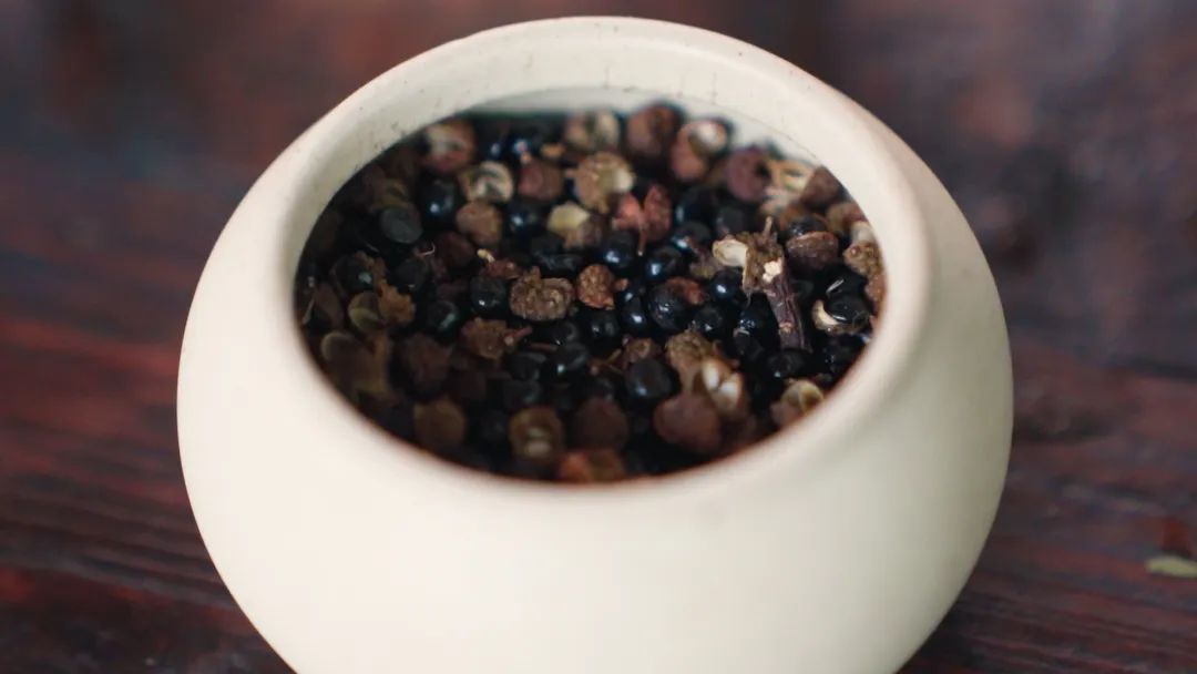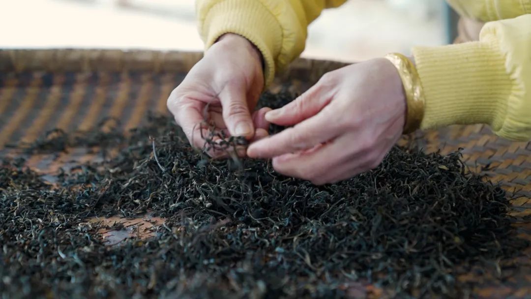 熏好的烟茶散发出浓郁的烟熏香味,这个时候需要再晾置一段时间,待“火气”散尽再进行最后一道工序——“拣茶”,把茶梗粗大、黄叶挑选出来,留下规整、干黑的好茶,一份谷雨烟茶制作好了。老唐夫妇赶紧包好,配上一罐烟茶的最佳“伴侣”——茶椒,寄给在外地工作的女儿。