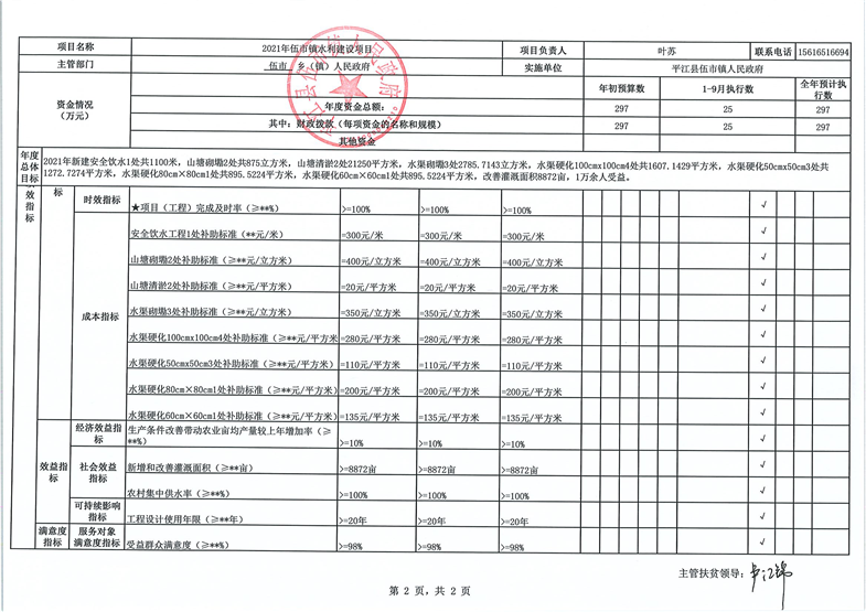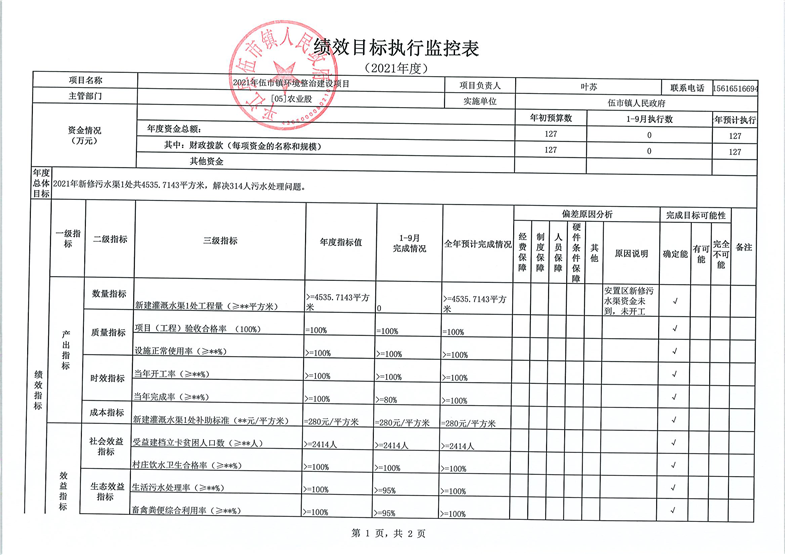 伍市镇2021年统筹整合涉农资金项目建设绩效监控表