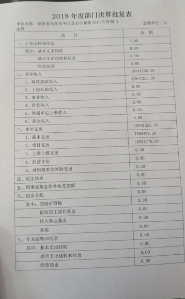 平江县财政局关于石牛寨镇2018年度部门决算批复的通知
