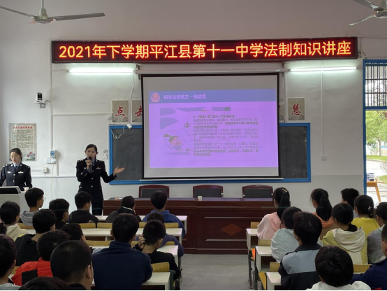 10月18日下午,童市镇政法线、派出所、新时代文明实践所、团委在十一中举办法治教育讲座,特邀请县公安局讲师团苏丹和罗维老师进行讲课,十一中八年级全体学生200余人参加,其余年级学生在教室收听广播。