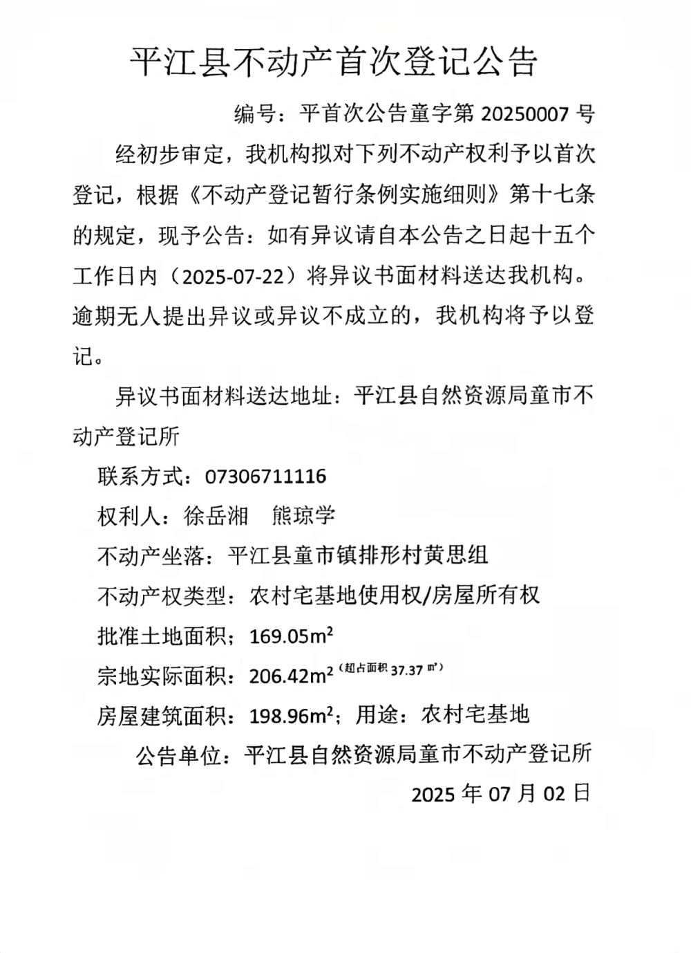 平江县不动产首次登记公告(徐岳湘 熊琼学)