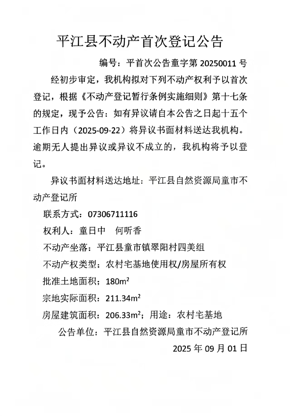 平江县不动产首次登记公告(童日中 何听香)