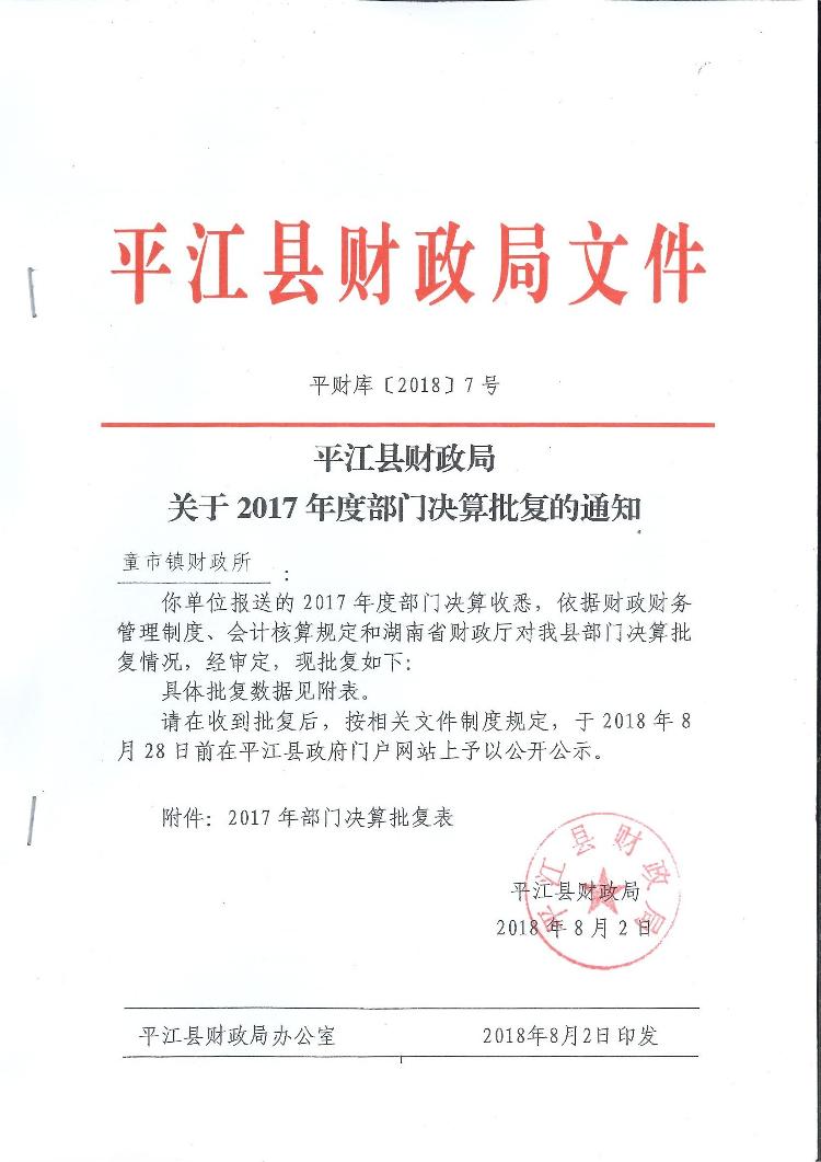 关于2017年度部门决算批复的通知