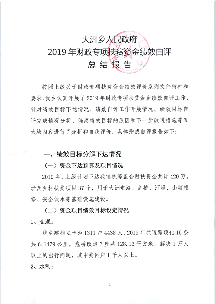 大洲乡2019年财政专项扶贫资金绩效自评总结报告