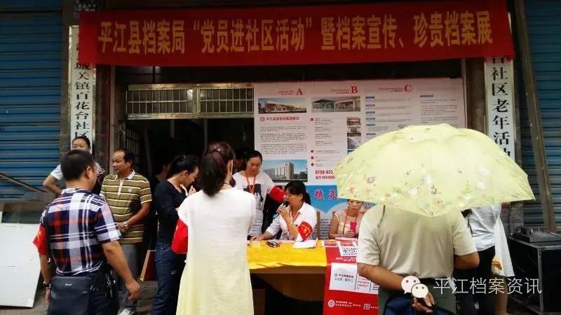 9月6日,平江县档案局和百花台社区联合举办“档案进社区暨珍贵档案展”。这次活动以陈列展板、发放宣传资料、档案法律知识有奖竞答、悬挂横幅及标语、播放录音等多种形式展开,对个人家庭档案、珍贵档案、档案法律法规进行了重点宣传。