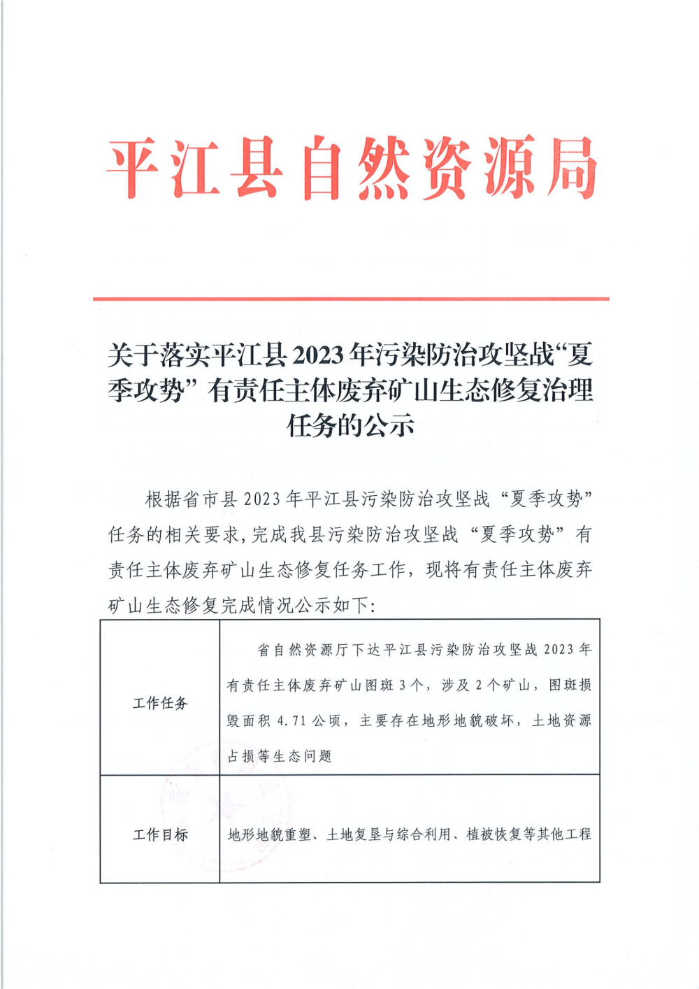 关于落实平江县2023年污染防治攻坚战“夏季攻势”有责任主体废弃矿山生态修复治理任务的公示