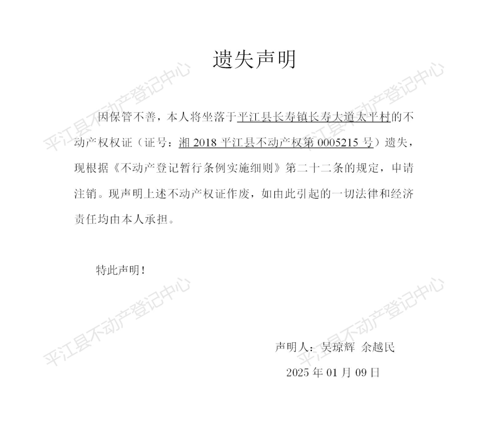 吴琼辉 余越民 不动产权证遗失声明2025002