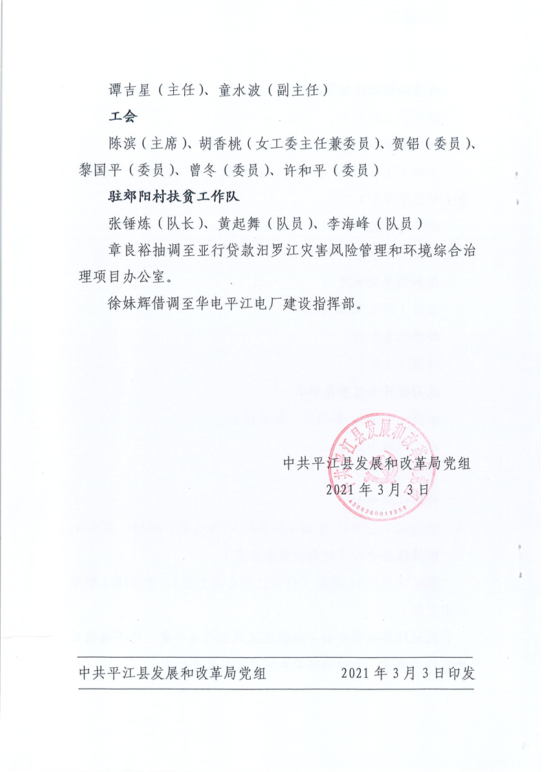 中共平江县发展和改革局党组关于2021年度机关干部分工安排的通知