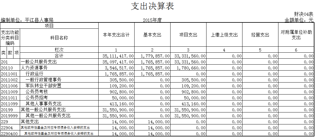 2015年公务员局全年收入合计35111417元,其中财政拨入35111417元(含纳入预算管理的非税收入50000元);全年支出合计35111417元,其中:基本支出1864886.38元、项目支出33246530.62元,按功能分类:工资福利支出1640275.77元、商品服务支出32738586..23元,其他资本性支出5050元;对个人及家庭的补助727505(包纳三支一扶工资及社会保障缴费);一般商品和服务支出其中福利费中全县机关事业单位离退休及在职人员死亡丧葬费、抚恤金及遗属补助支出31439277.02元,其他商品和服务支出中包括全县评模奖430000元、清理空饷费用470000元及军转经费109200元。                                            三、意见和建议