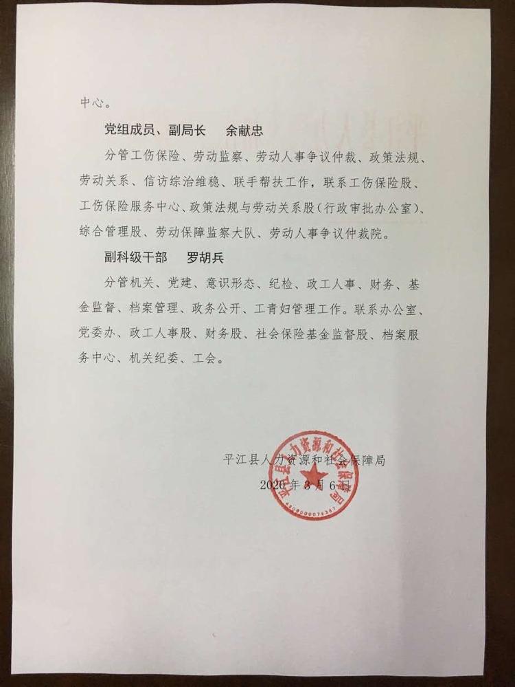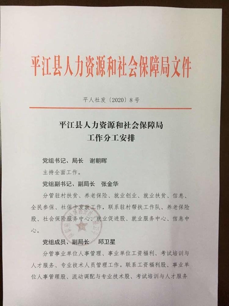 平江县人力资源和社会保障局工作分工安排