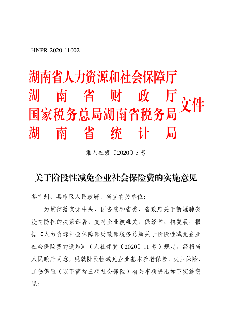 湖南省人力资源和社会保障厅 湖南省财政厅 国家税务总局湖南省税务局 湖南省统计局关于阶段性减免企业社会保险费的实施意见