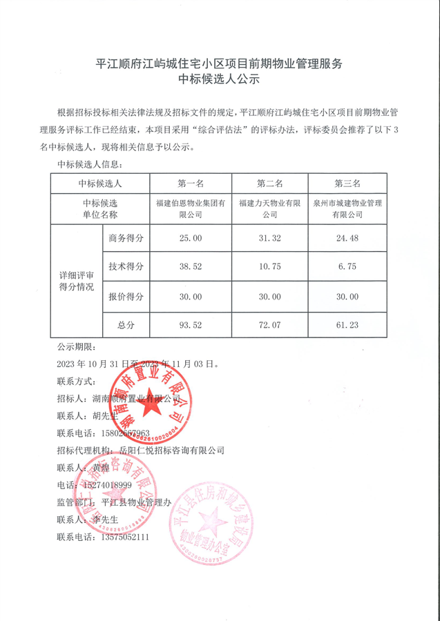 中标候选人公示(顺府江屿城住宅小区项目前期物业管理服务)
