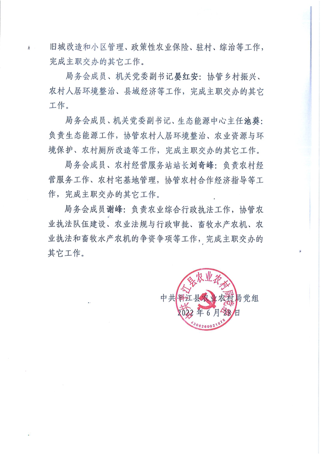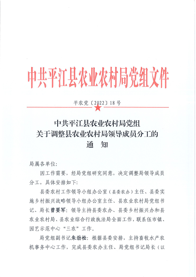 今年平江县农业农村局领导班子成员未调整,继续沿用以下文件: