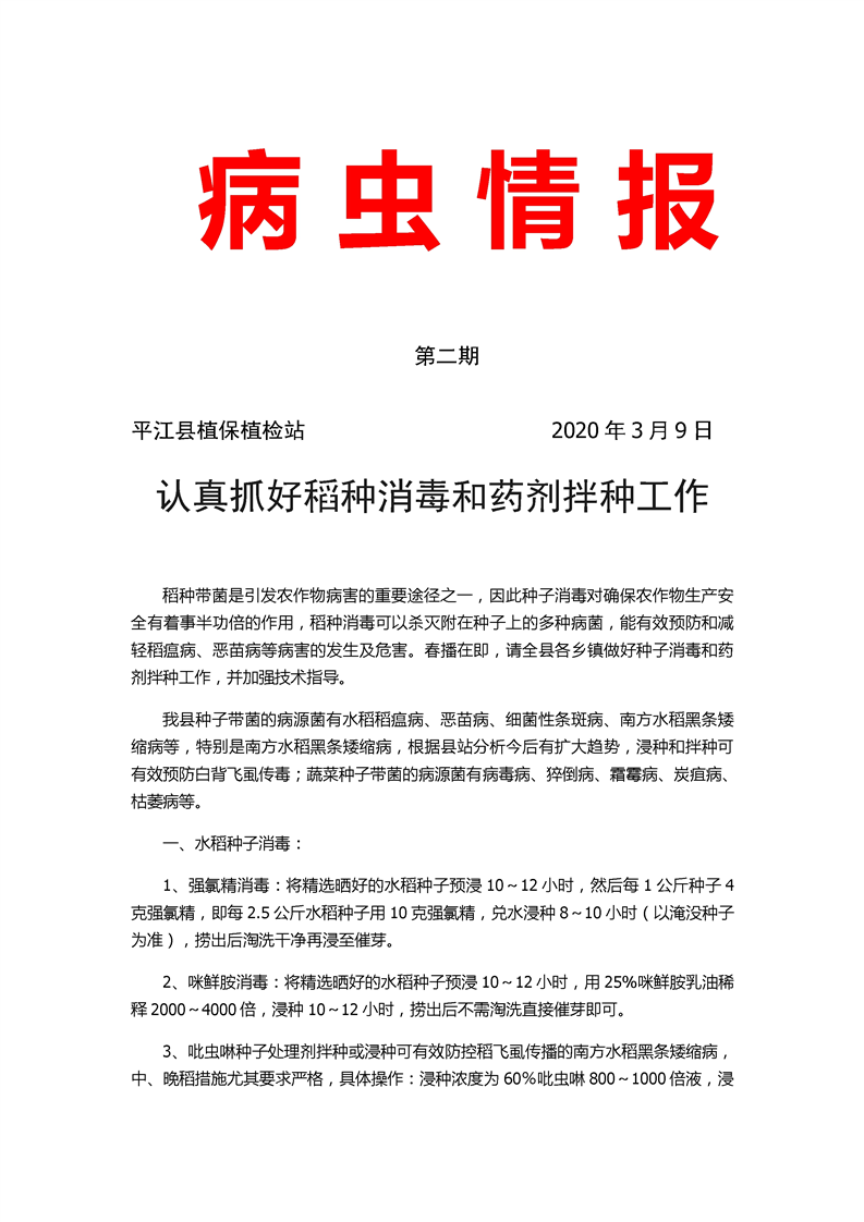病虫情报(第二期)认真抓好稻种消毒和药剂拌种工作