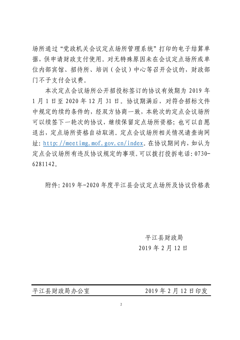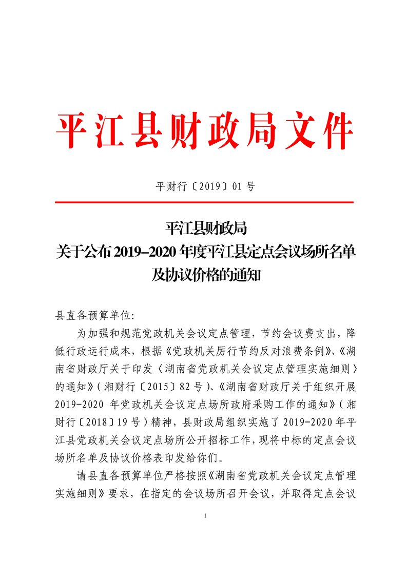 平江县财政局关于公布2019-2020年度平江县定点会议场所名单及协议价格的通知