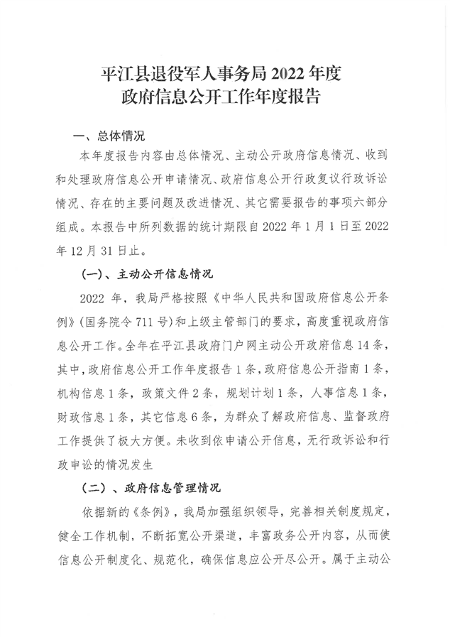 平江县退役军人事务局2022年度政府信息公开工作年度报告