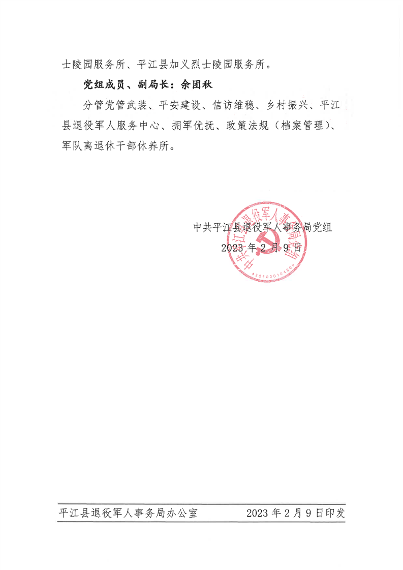 平江县退役军人事务局2023年领导班子成员分工安排