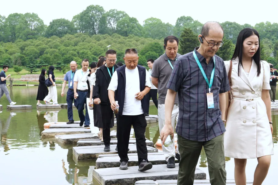在华雅盘石洲森林花园,观摩团嘉宾们沉浸式与大自然亲密接触。景区三面环江,犹如一张“绿色飞碟”飘浮于江水之上,湖光山色美不胜收。四周高山林木苍翠,古树参天,仿佛是大自然精心绘制的一幅画卷。景区用特色园艺打造的五福岛、青云桥、溪涧栈道等景观和山庄,层楼叠榭,一步一景。