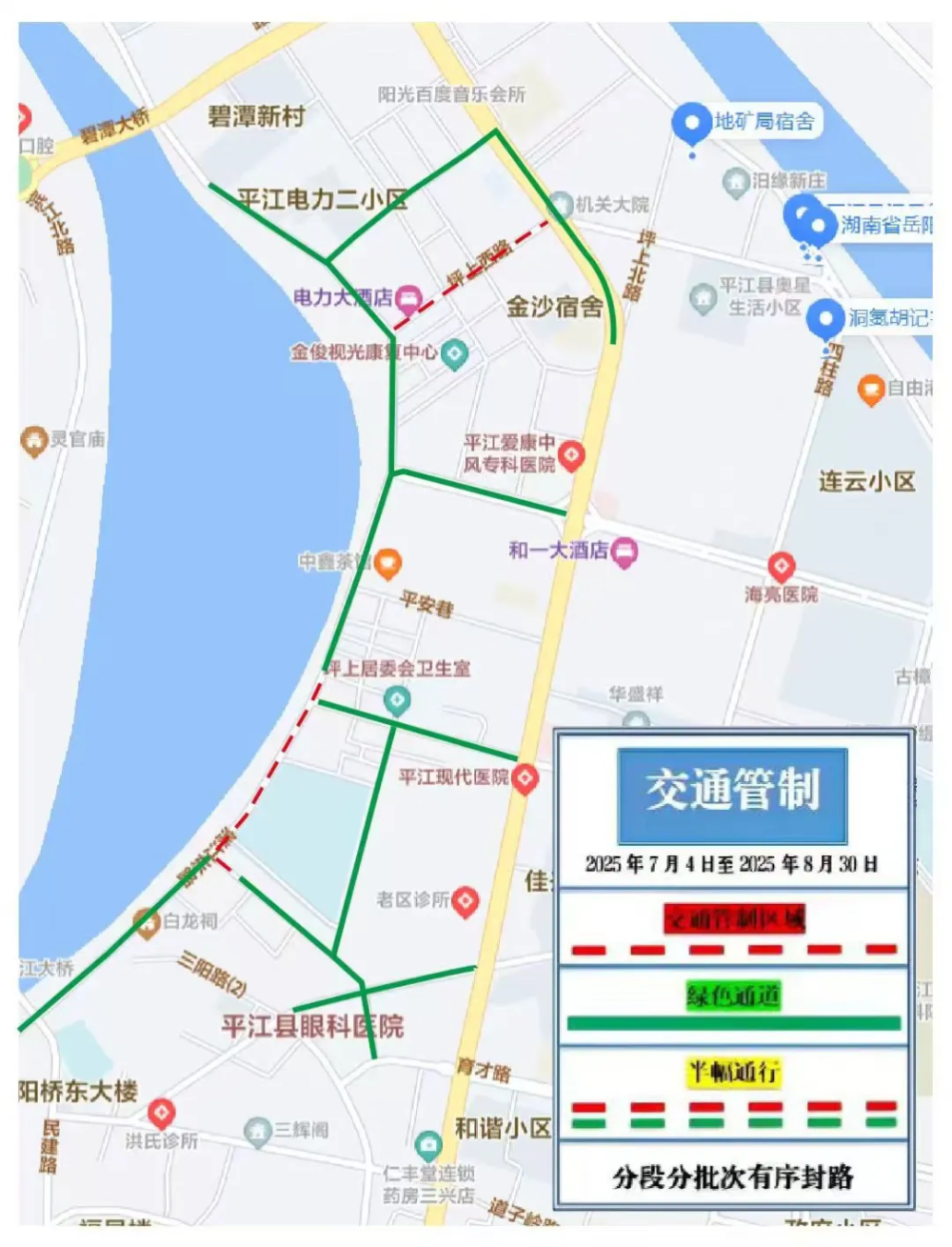 大桥西路:民建路路口至平江大桥半幅:(半幅分段封闭施工),时间:7月4日至8月30日