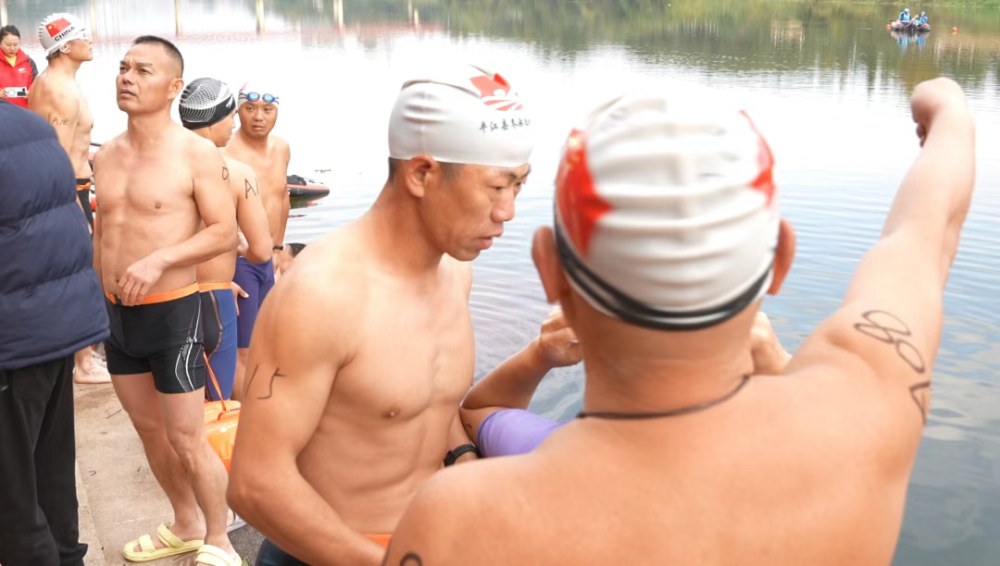 不远处,10岁的卢弘扬正有模有样地摆动双臂做热身。父亲在一旁鼓劲道:“能下水,今天就是成功了。”在爸爸的贴身守护下,这位年纪最小的选手勇敢地完成了挑战,上岸时兴奋地对着镜头比出胜利的“V”字。