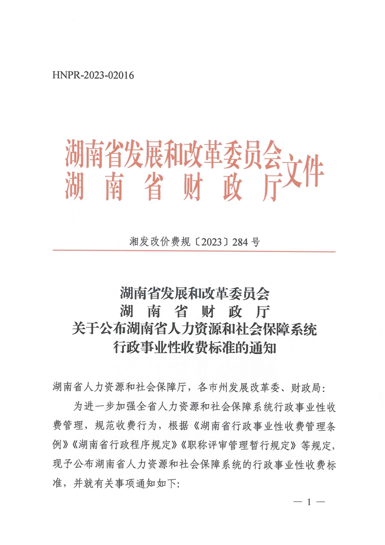 关于公布湖南省人力资源和社会保障系统行政事业性收费标准的通知(湘发改价费规[2023]284 号)