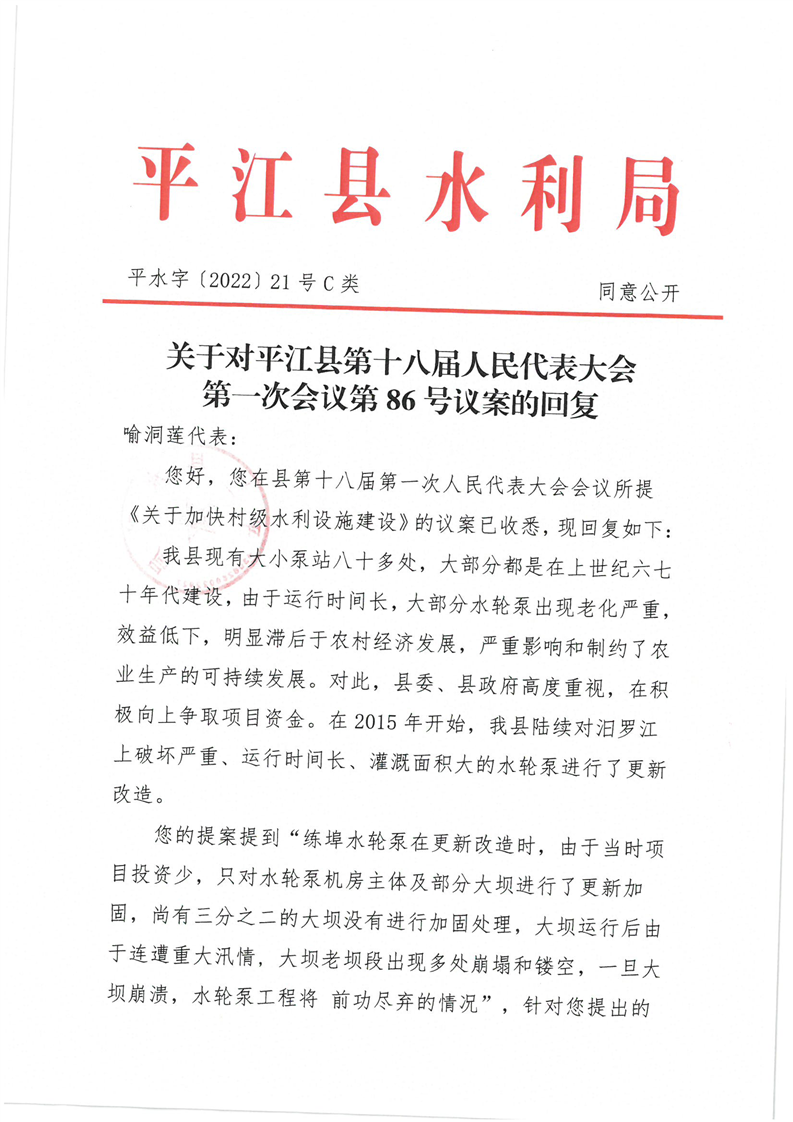 关于对平江县十八届人大一次会议第86号议案的回复
