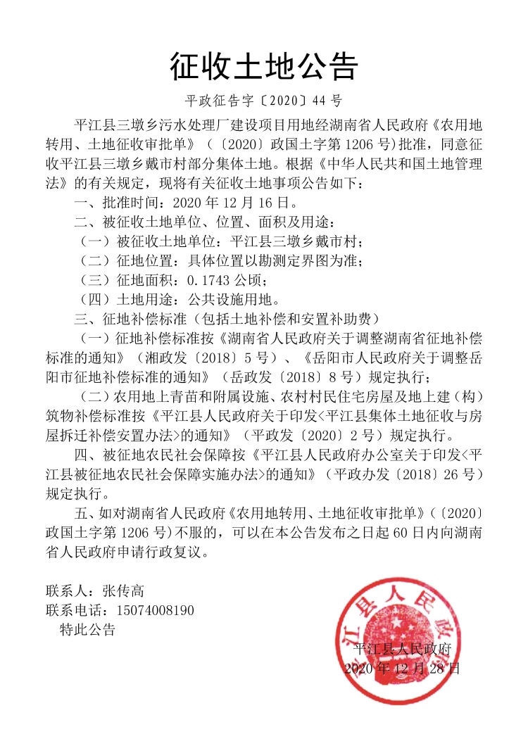 平江县三墩乡污水处理建设项目征收土地公告