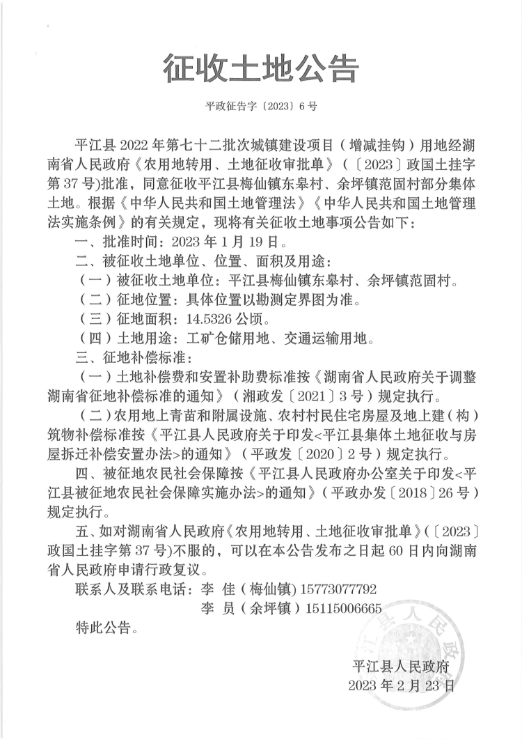 平江县2022年第七十二批次城镇建设项目征收土地公告