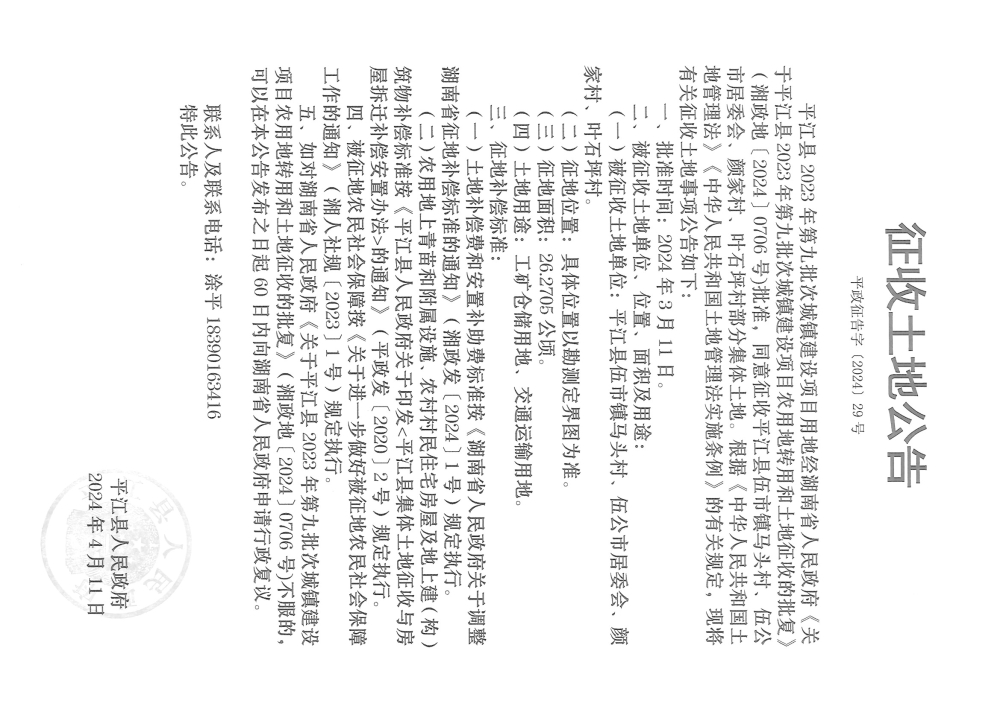 平江县2023年第九批次城镇建设项目 征收土地公告
