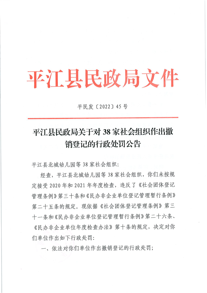 平江县民政局关于对38家社会组织作出撤销登记的行政处罚公告