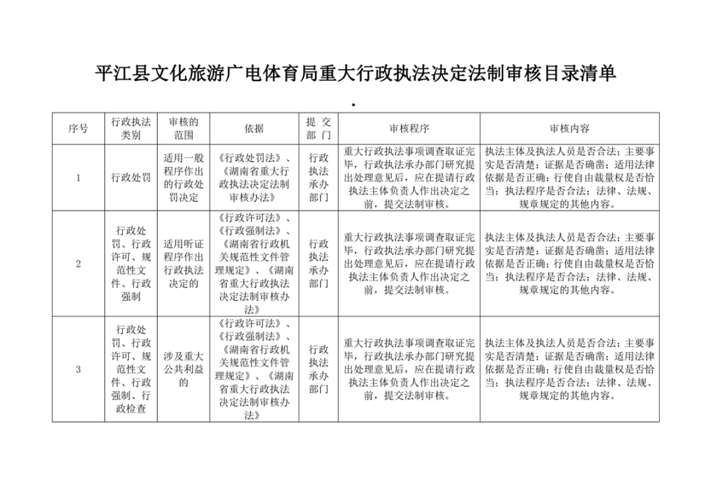 平江县文化旅游广电体育局文化综合市场重大行政执法决定法制审核目录清单