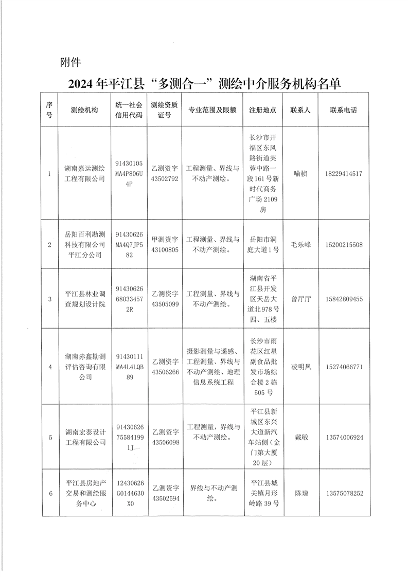 关于公布2024年平江县“多测合一”测绘中介服务机构名录库名单的公告