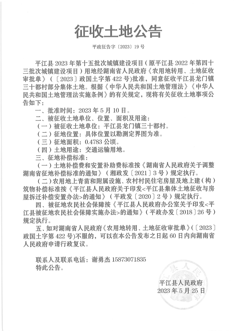 平江县2023年第十五批次城镇建设项目征收土地公告