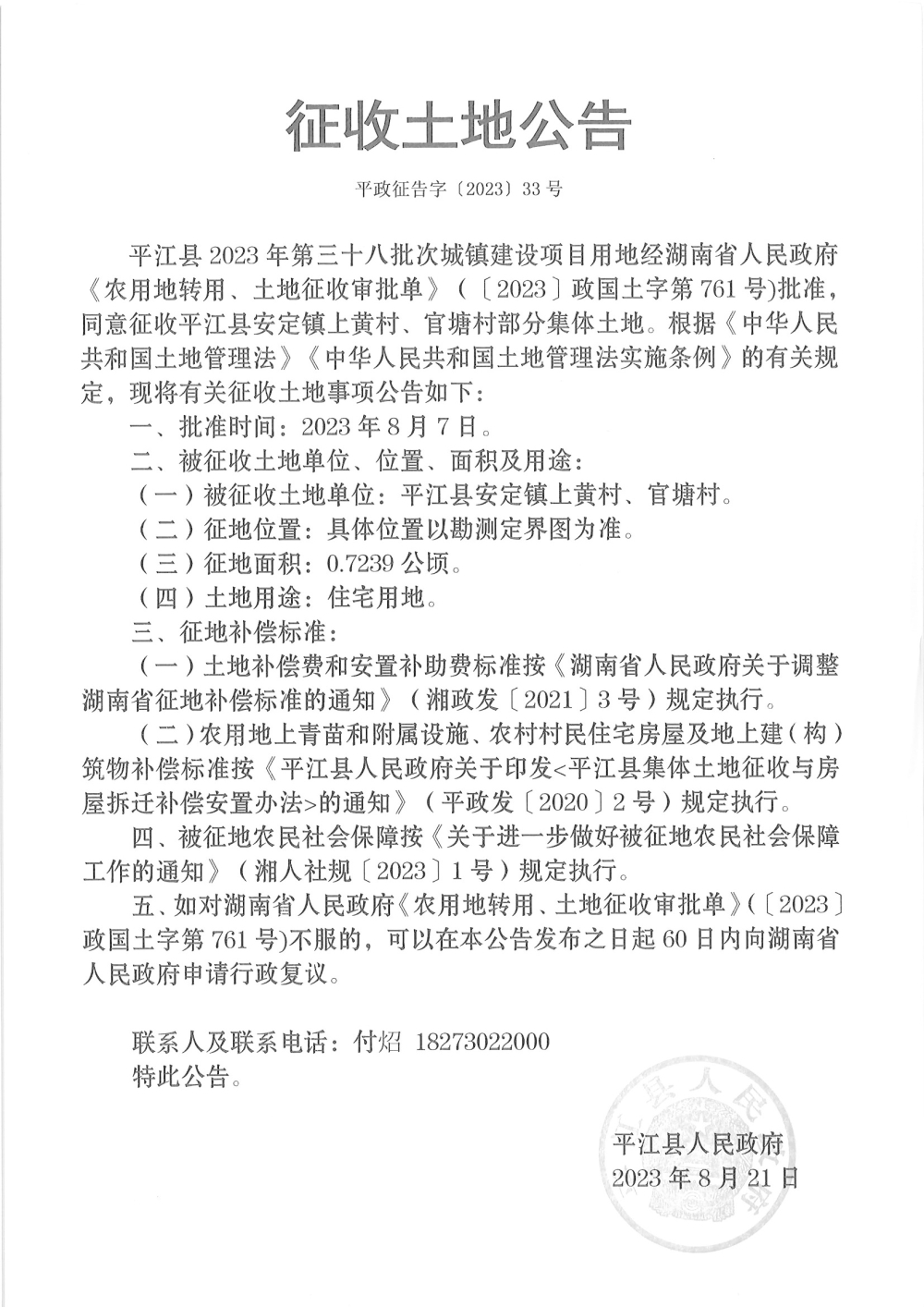 平江县2023年第三十八批次城镇建设项目征收土地公告