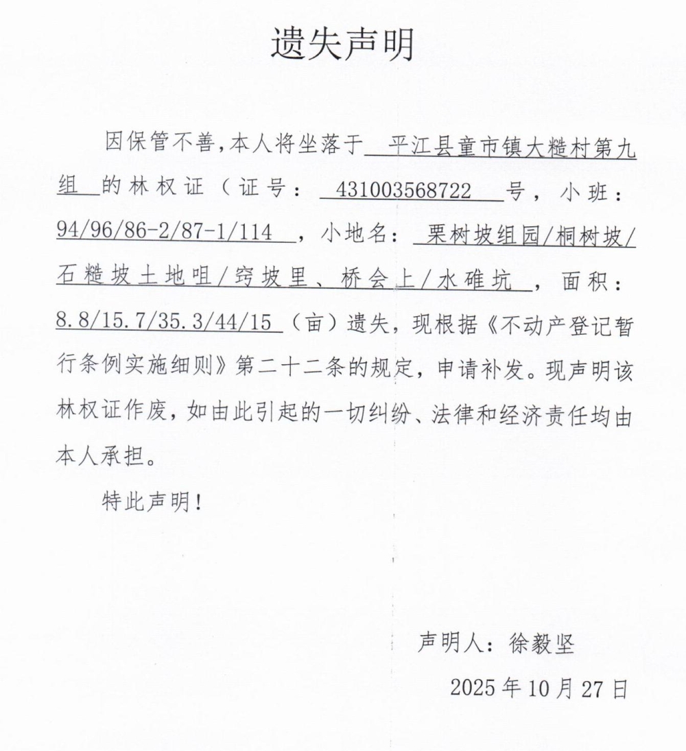 徐毅坚林权证遗失声明