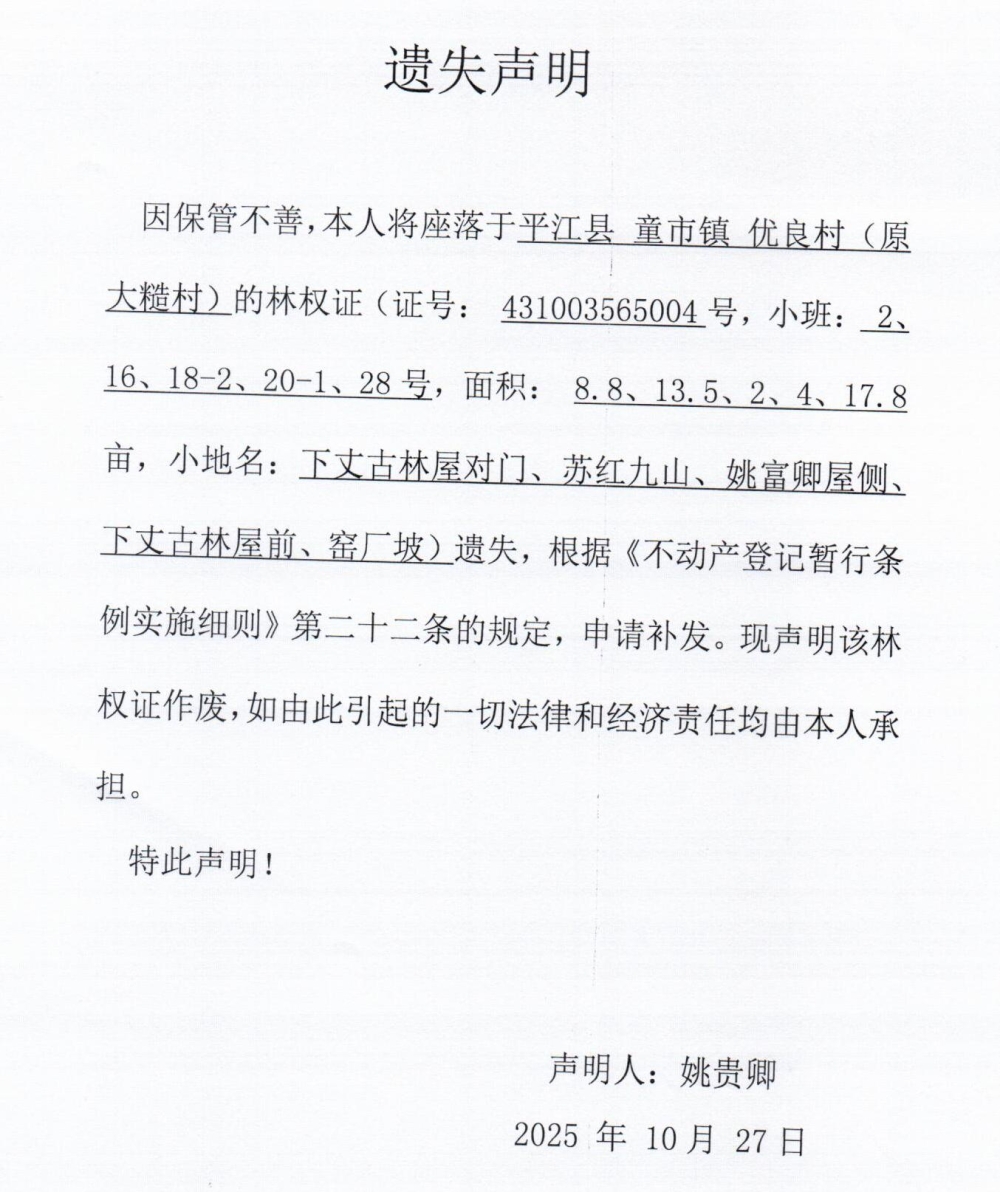 姚贵卿林权证遗失声明