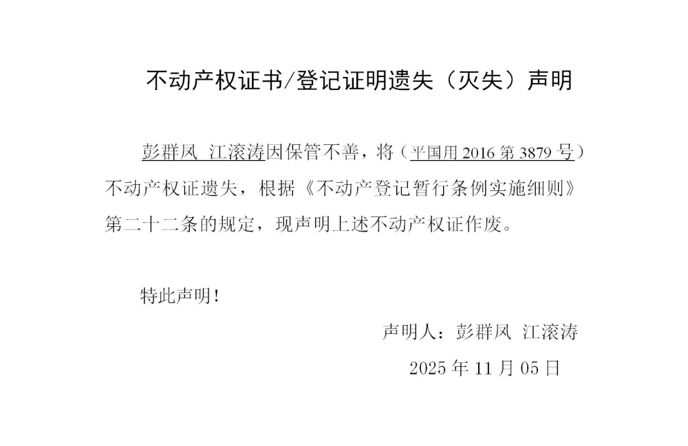 彭群凤 江滚涛 不动产权证遗失声明202581