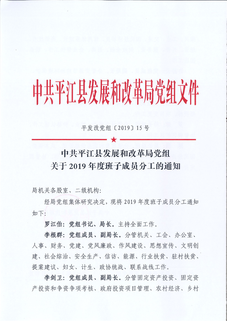 中共平江县发展和改革局党组关于2019年度班子成员分工的通知