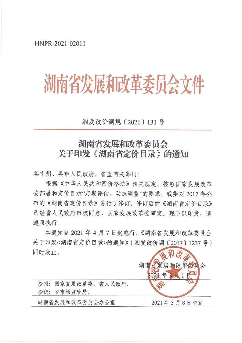 湖南省发展和改革委员会关于印发《湖南省定价目录》的通知