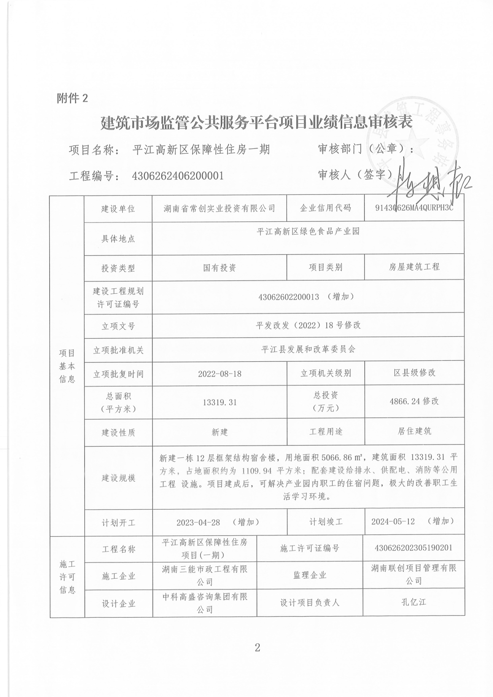 建筑市场监管公共服务平台项目业绩信息审核表-平江高新区保障性住房一期
