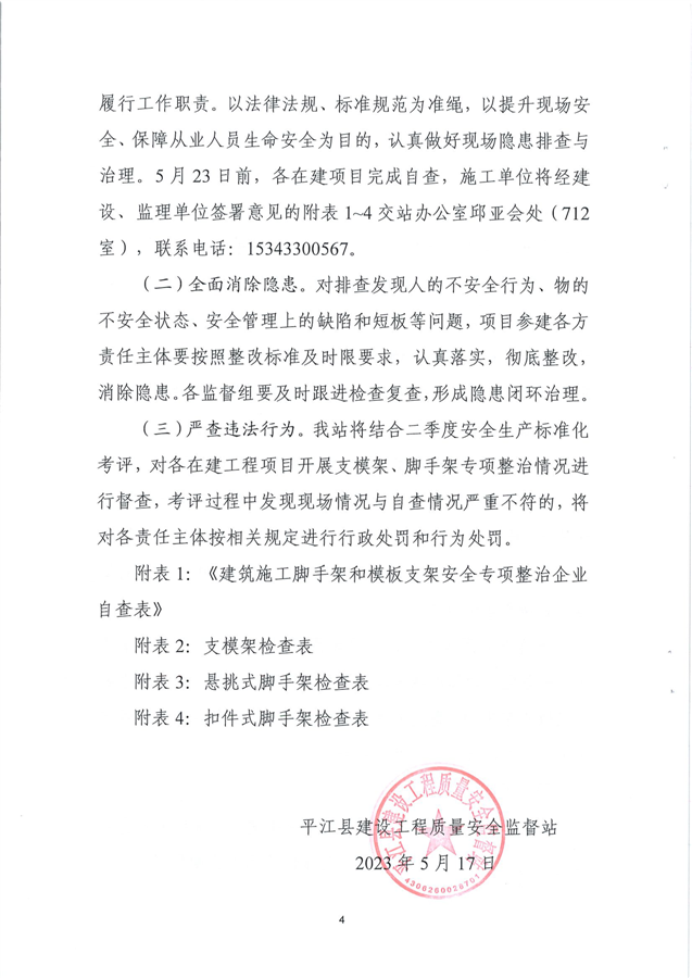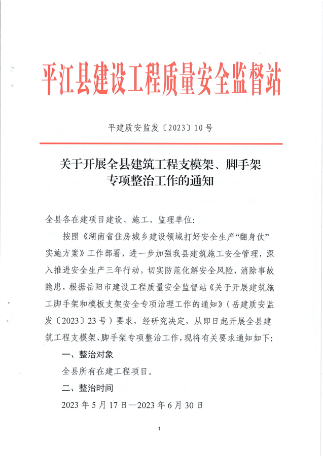 关于开展全县建筑工程支模架、脚手架专项整治工作的通知(平建质安监发[2023]10号)