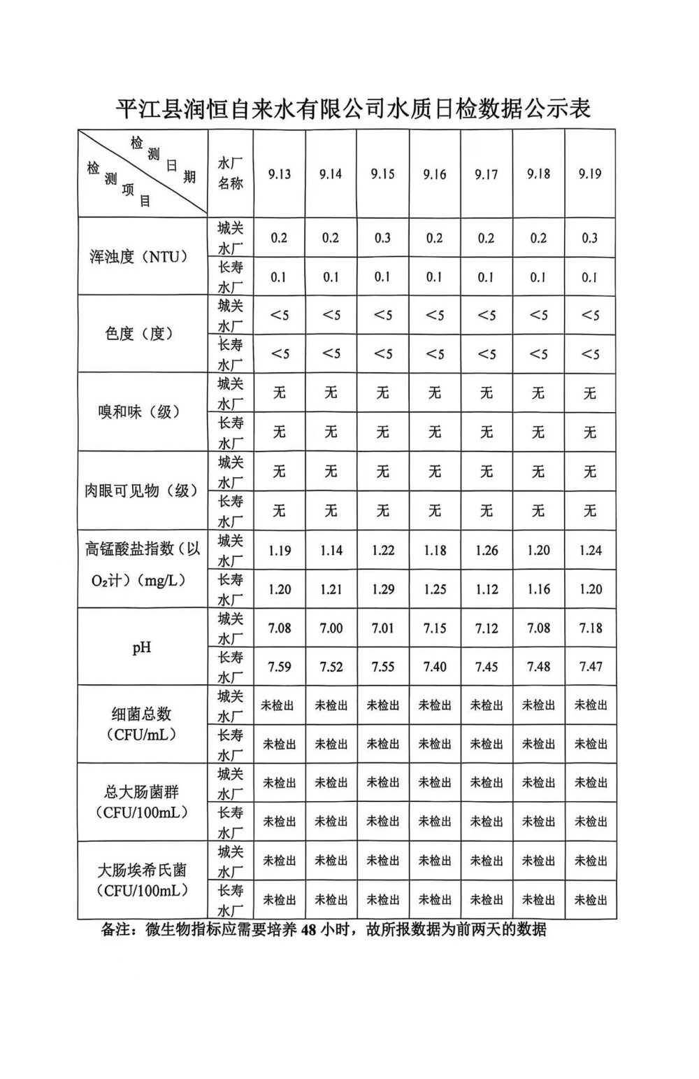 平江县润恒自来水有限公司水质日检数据公示表9.19