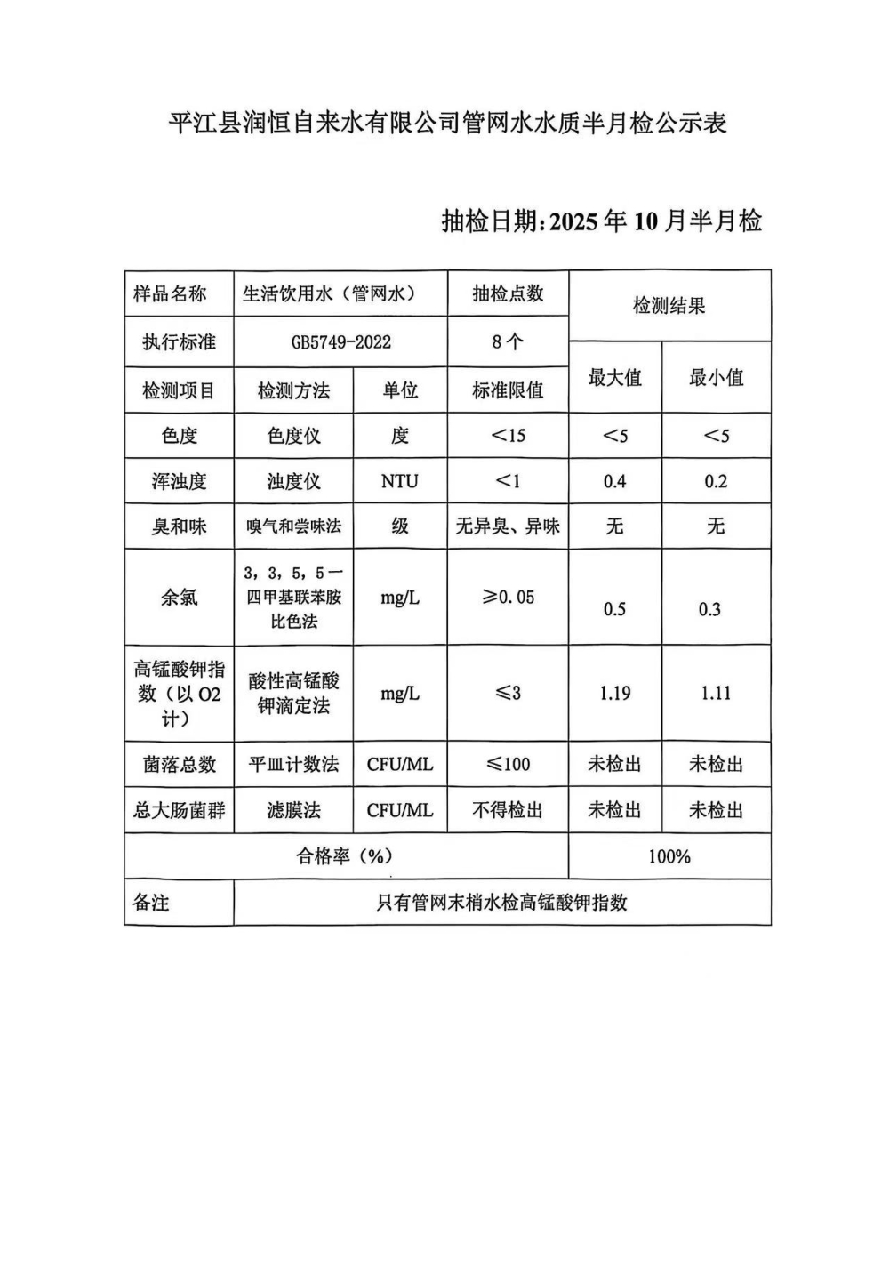 平江县润恒自来水有限公司管网水水质半月检公示表10.24