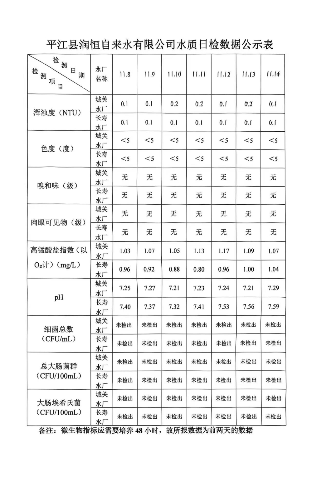 平江县润恒自来水有限公司水质日检数据公示表11.14