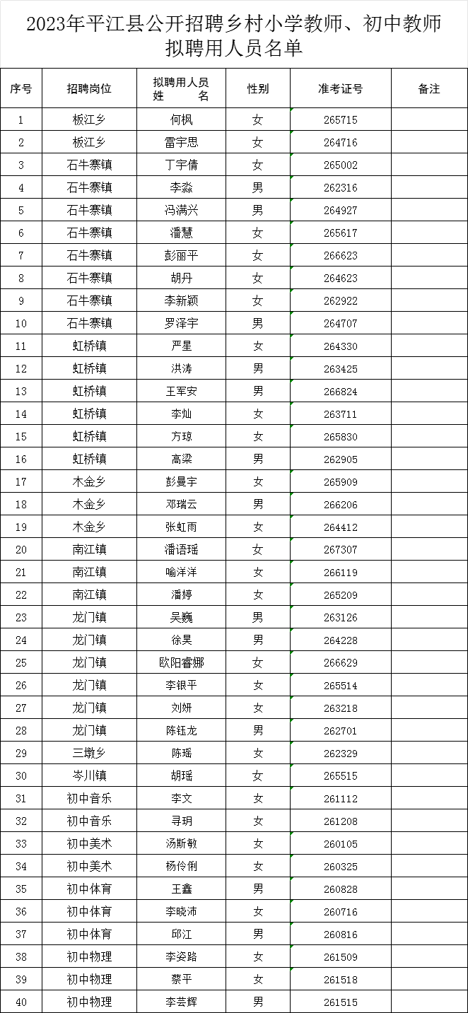 附:2023年平江县公开招聘乡村小学教师、初中教师拟聘用人员名单